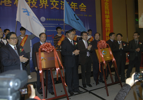 齐让、李意珍、梁明等领导嘉宾为深港科技联盟、深港全民科学素质行动计划揭幕